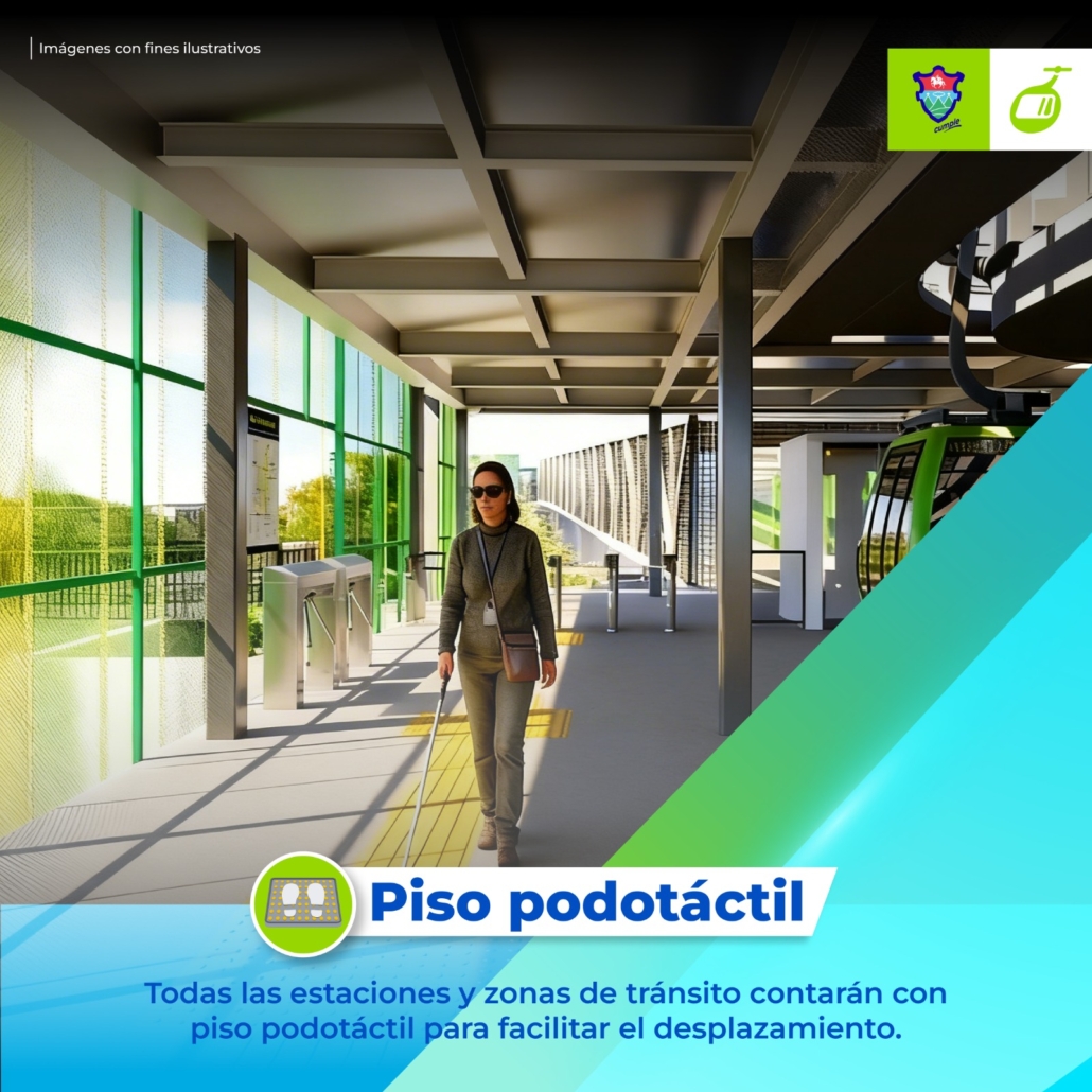 En el interior de las estaciones y en las áreas cercanas se instalará piso podotáctil, una guía que ayuda a las personas con discapacidad visual a orientarse de forma segura. También se incorporarán rampas en los puntos donde exista cambio de nivel, eliminando escalones innecesarios.