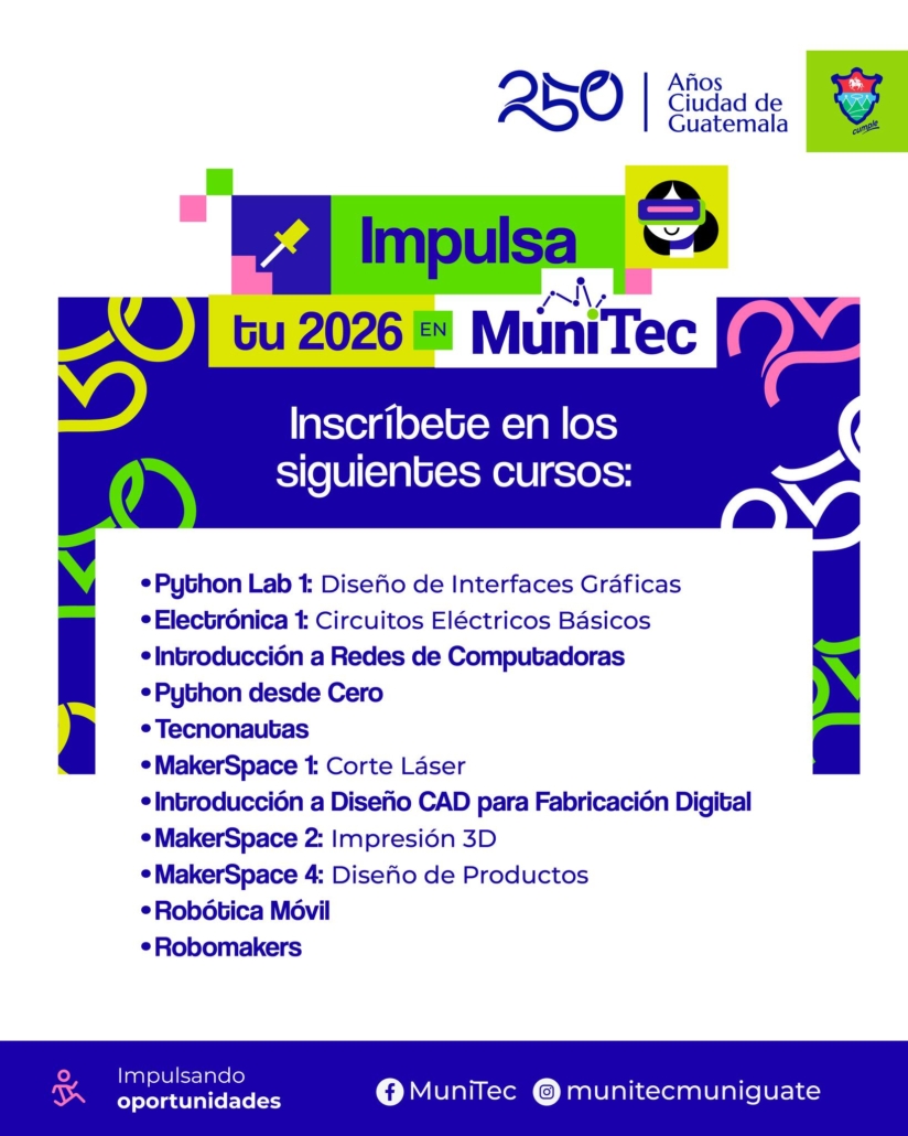 Como parte de este programa, en 2026 MuniTec nuevamente abre sus puertas para la inscripción a cursos tecnológicos, dirigidos a personas de todas las edades, desde niñas y niños hasta jóvenes y adultos interesados en aprender de forma práctica y aplicada.
